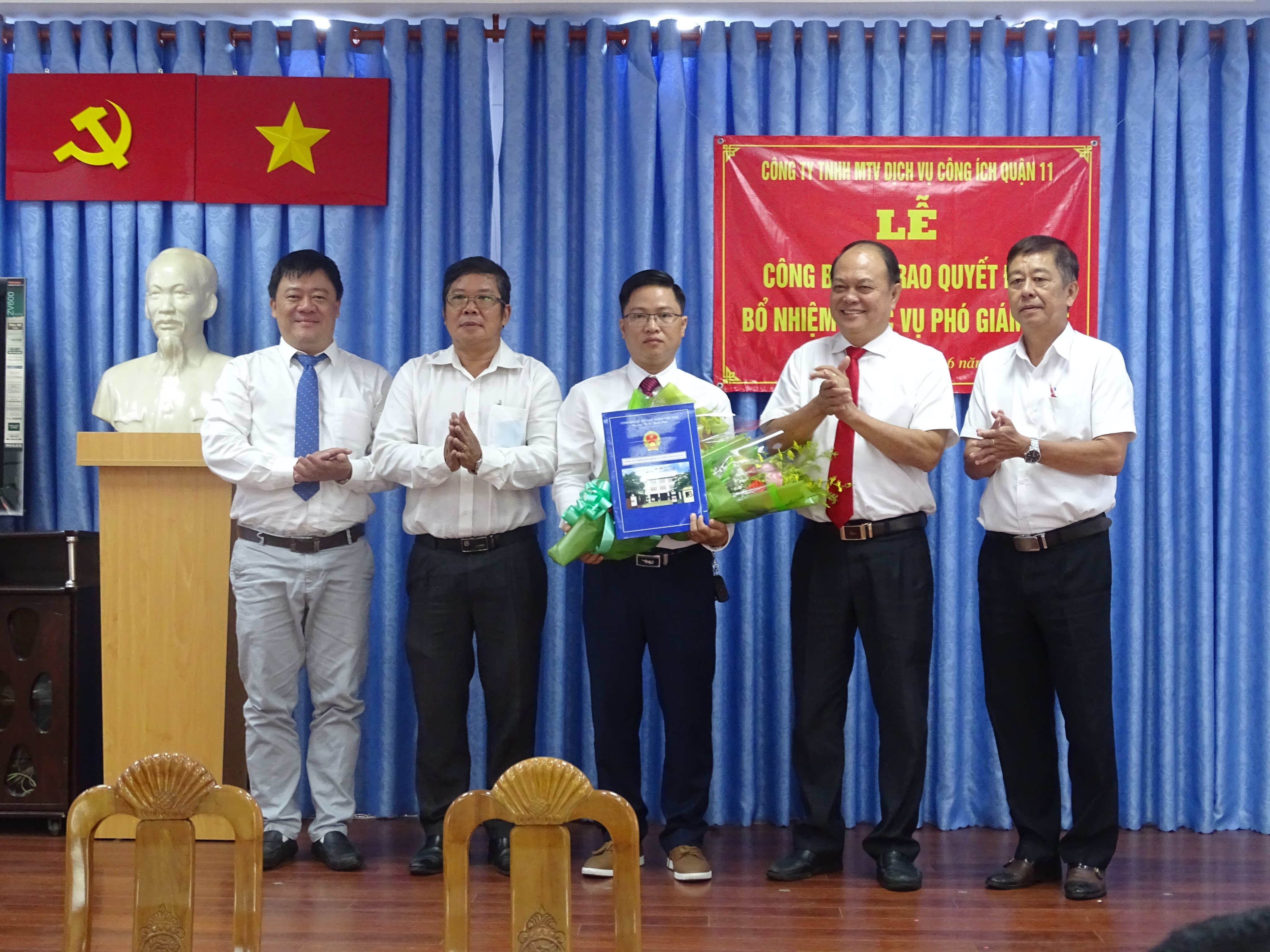 Đại diện lãnh đạo UBND Quận và lãnh đạo Công ty tặng hoa chúc mừng ông Phạm Mạnh Tuyên – Tân Phó Giám đốc Công ty TNHH MTV Dịch vụ Công ích Quận 11